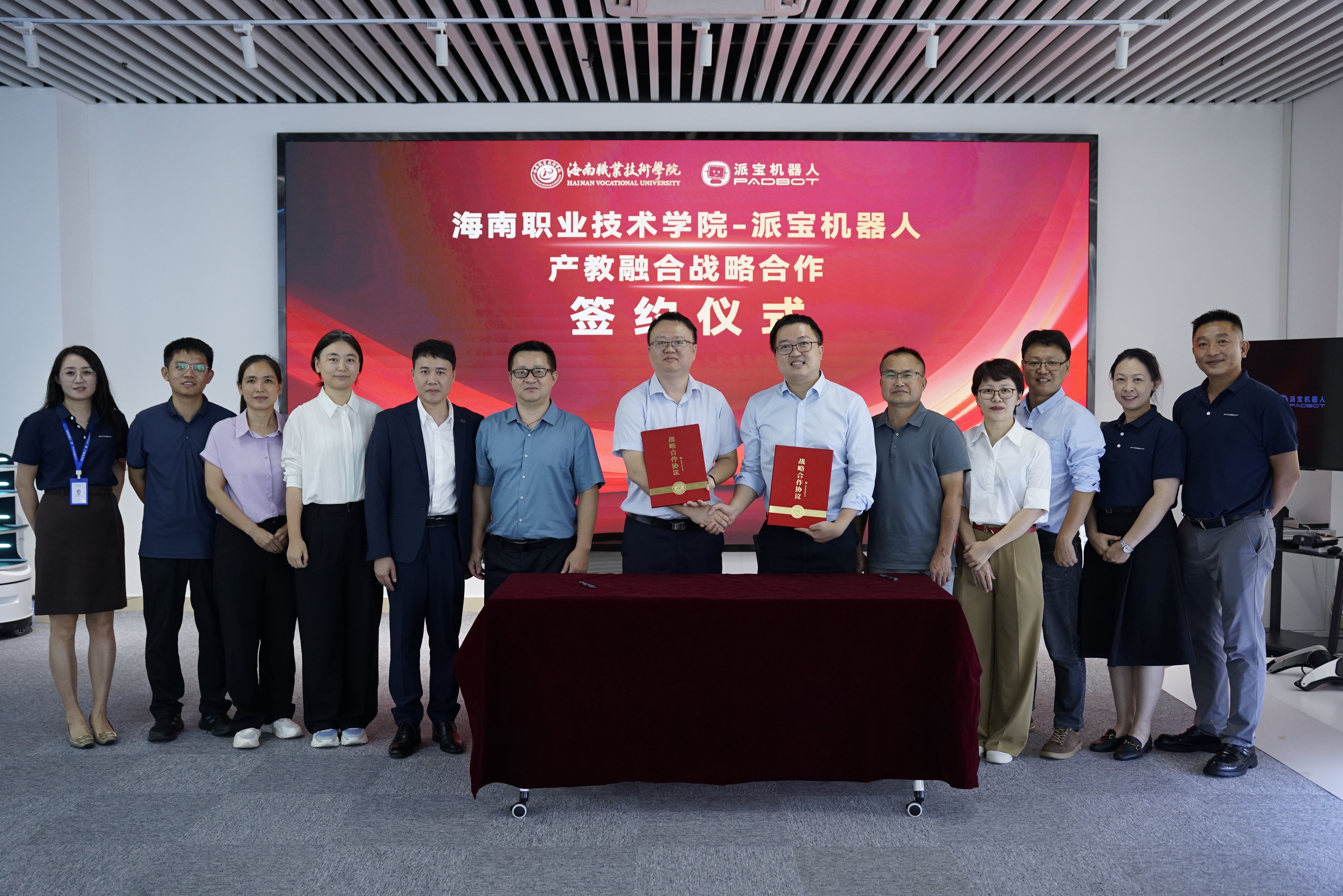 广州映博智能科技有限公司(派宝机器人)是一家从事计算机系统服务、物联网技术研发、人工智能行业应用系统机硬件服务等业务的公司,该公司的服务机器人产业在国内处于领先水平。工业与信息学院与该企业经过多次沟通,达成了合作意向。本次交流会在海口市龙华区区长邓力榕、龙华区工信局副局长周让豪的共同见证下,双方签订了校企合作协议,达成了共建人工智能专业的的明确共识。