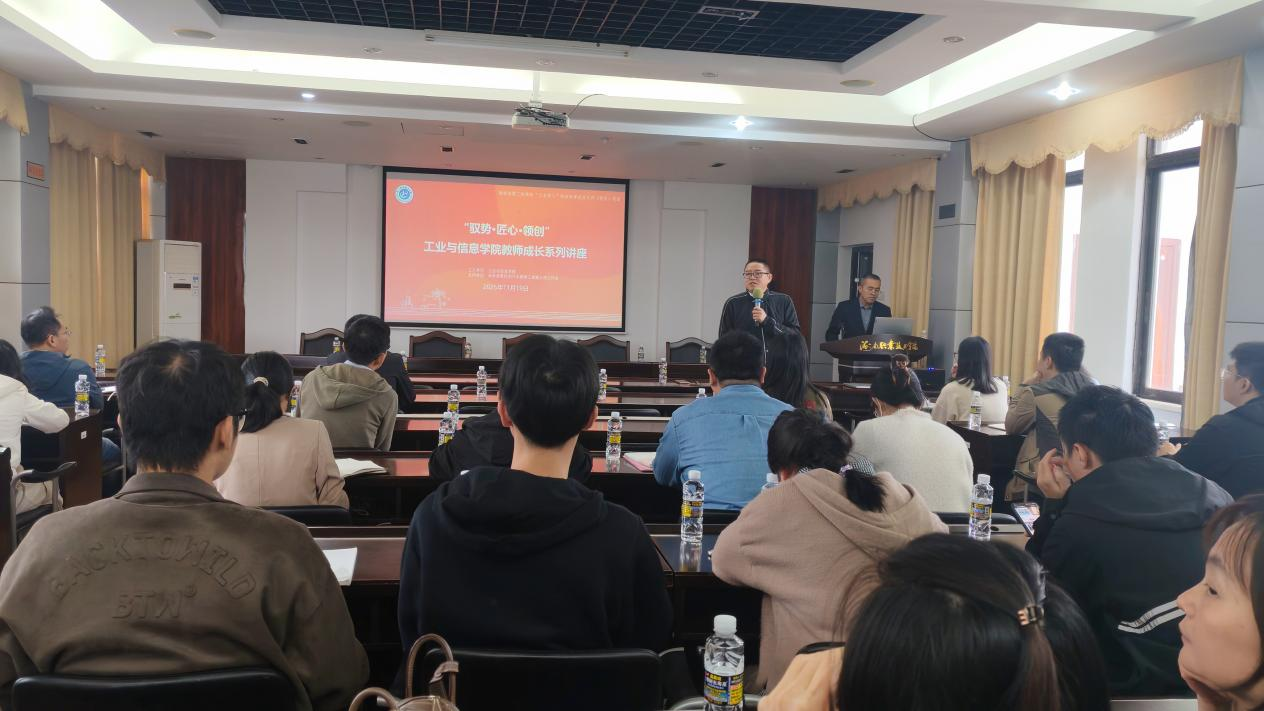 2025年,工业与信息学院新进教师将近30人,为使新教师更好更快地融入教育教学岗位,11月19日下午,工业与信息学院开展“教师成长系列讲座”。本次讲座由工信学院院长助理葛红剑主持,全院教师现场参会,旨在通过科研、技能比赛、教学运行三方面的经验分享,为学院新教师成长提供便捷通道,培育综合素质扎实的教师队伍提供实践指引。