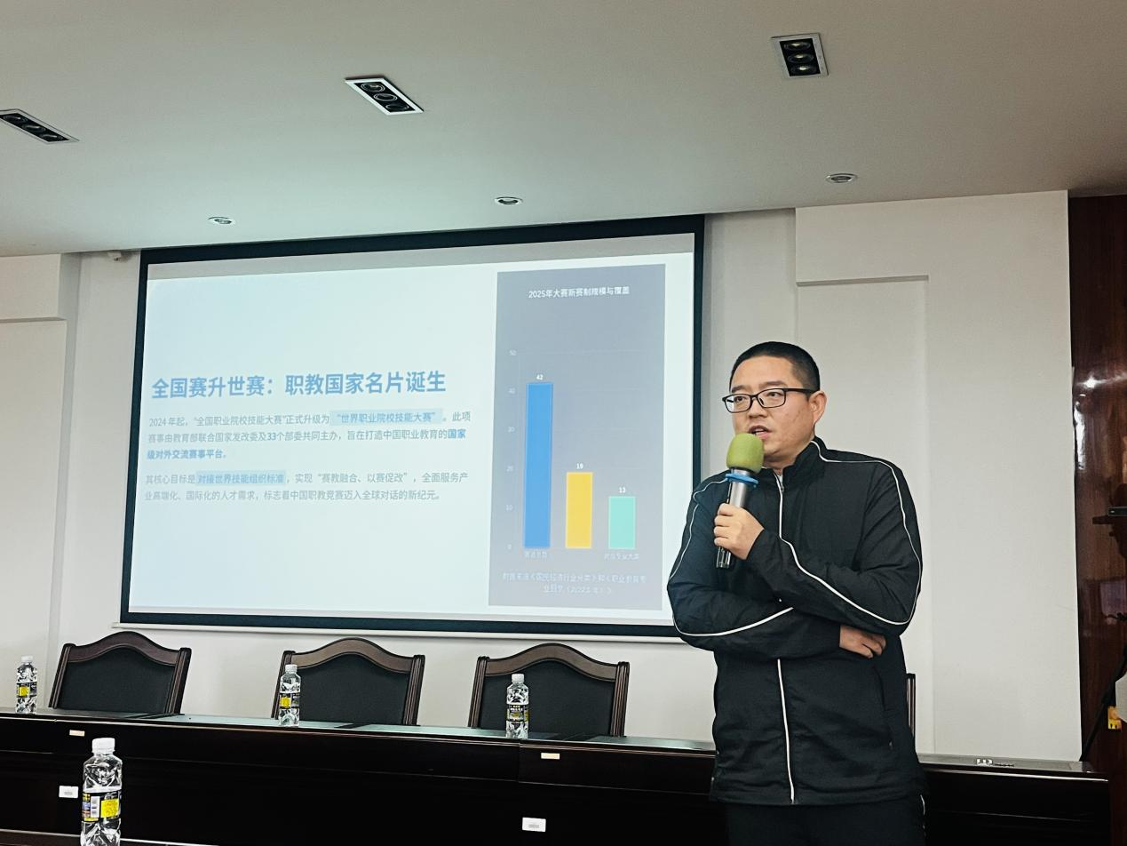 讲座第二场,院长助理葛红剑副教授以2025年参加世界技能大赛执裁经历为例,主讲《新赛制下世界职业院校技能大赛关键点分析》,详细分享了世赛的新规则和评分细则,选手的得分要点,裁判的注意事项等,为技能型教师的成长带来满满干货。