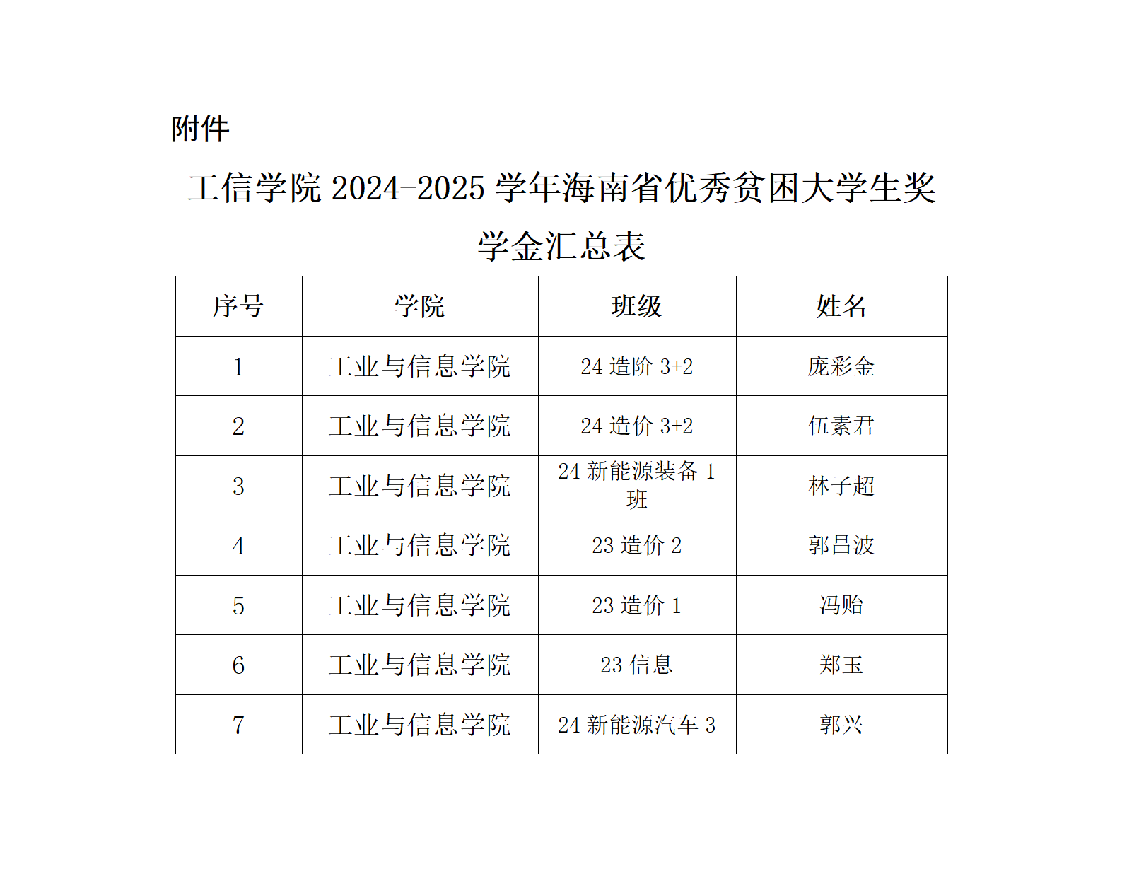附件:工信学院2024-2025学年海南省优秀贫困大学生奖学金汇总表